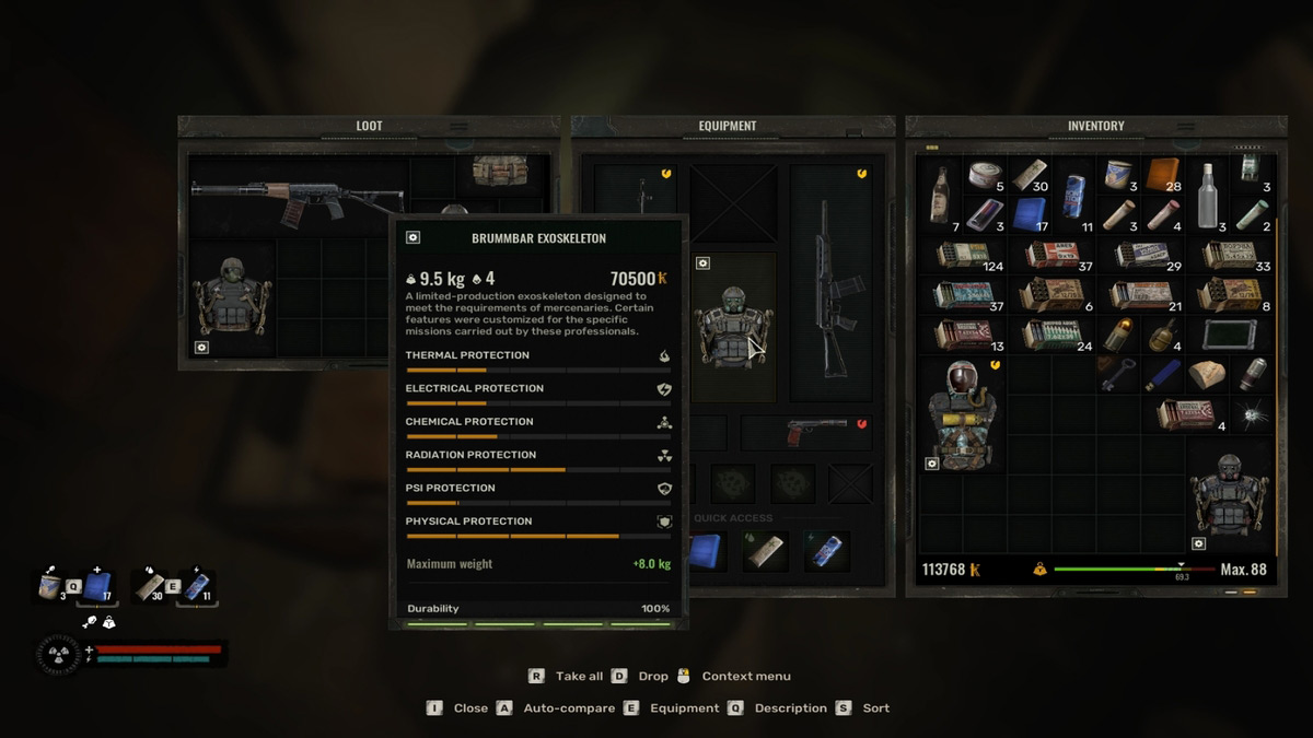 Brummbar Exoskeletonは、優れた物理的保護、まともな放射防御、および熱、電気、および化学の異常に対する平均耐性を提供します。この鎧はより重い側にありますが、+8.0 kgのボーナスを提供し、速度で過負荷にならずにより多くの体重を運ぶことができます。