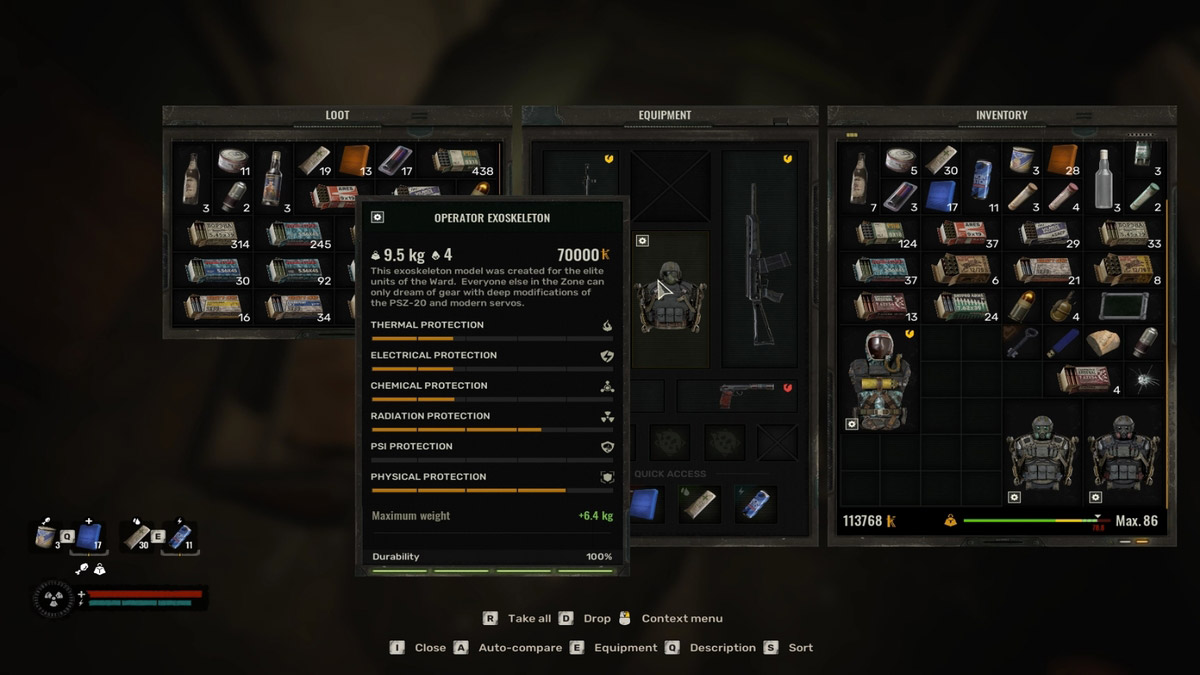オペレーターの外骨格は、病棟派のエリート兵士向けに設計されており、ストーカー2で最高の物理的および放射線保護の一部を提供しています。しかし、その欠点はPSI保護の欠如です。