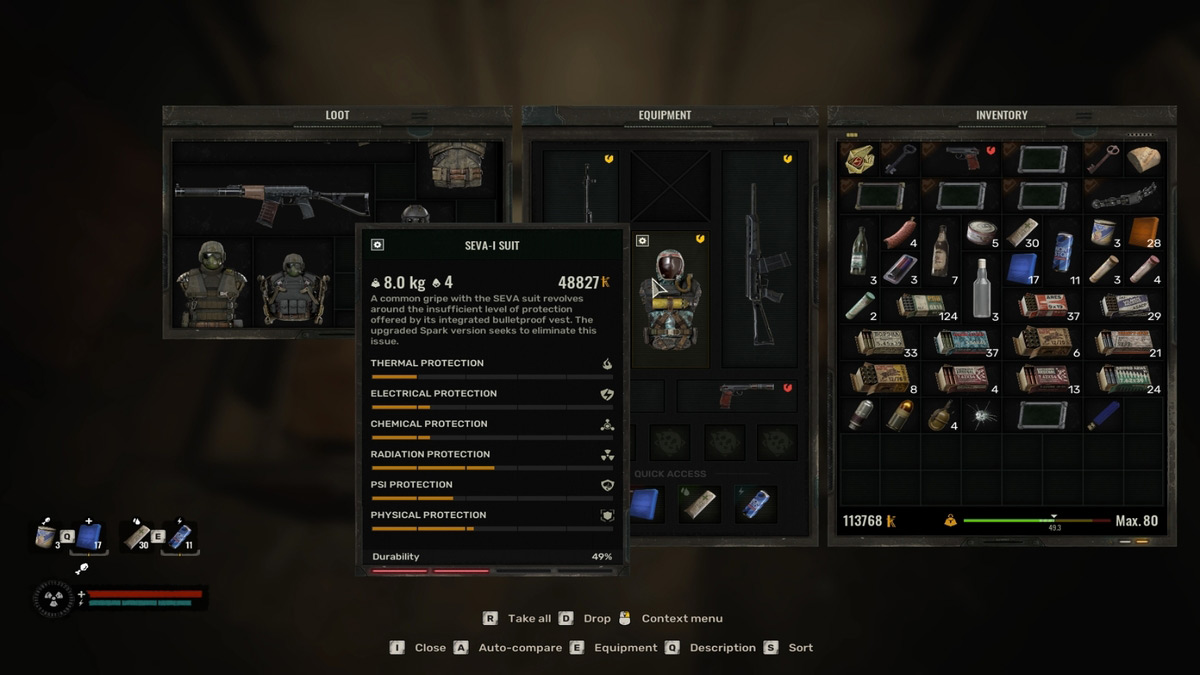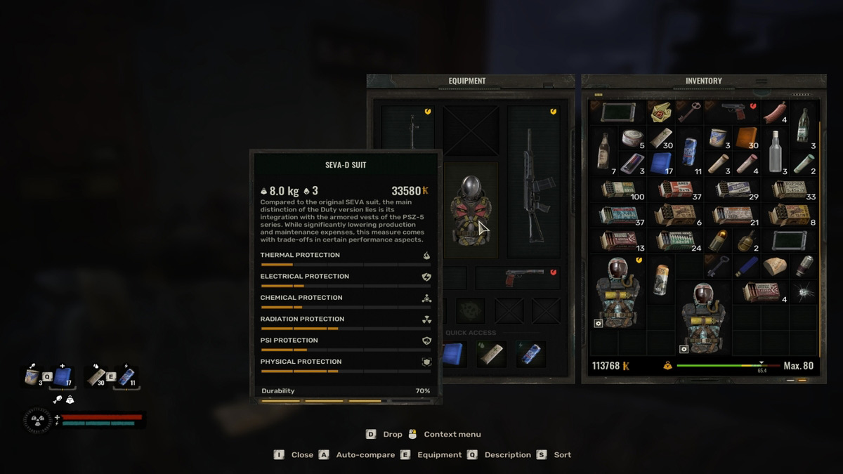 後で利用可能な外骨格装甲と同じレベルの物理的および放射線保護を提供しませんが、SEVA-Dは異常、PSIの影響、放射線排出、弾丸に対する優れた防御を提供します。