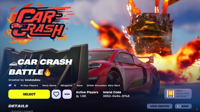 あなたが想像できるならFortniteはDestruction Derbyに会います、自動車事故の戦いがあります。選択できる車両がたくさんあり、戦闘する信じられないほどのドライバーがいくつかあります。運転がひどい場合でも、このクリエイティブマップはいくつかの練習を得るための素晴らしい方法バトルロワイヤルとゼロビルドモード用。