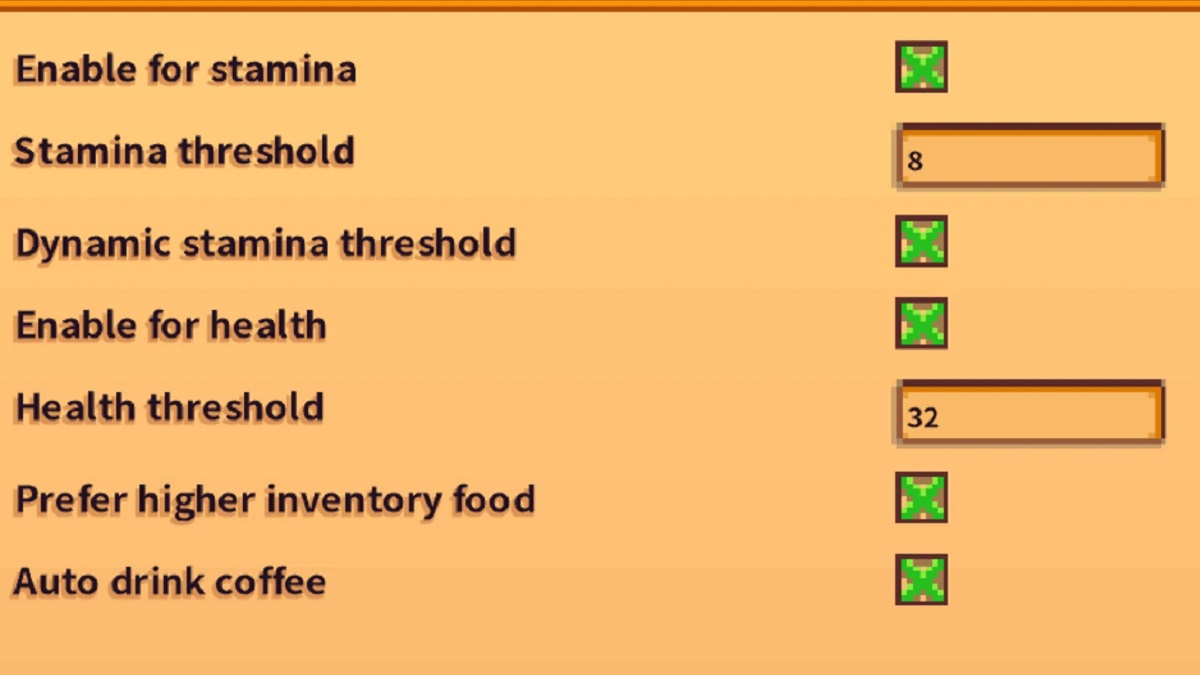 RuanimalによるこのMODは、何よりも便利なものであり、それが私がそれを愛している理由です。追加の設定を追加することにより、下にドロップしたくない健康とエネルギーのしきい値を選択します。設定された後、あなたのキャラクターは、そのしきい値の下で落とそうとしているときに、在庫から食料品を自動的に食べます。その後、在庫に食物を持っている限り、健康が失われたときに、エネルギーなしや死から死ぬことを心配する必要はありません。