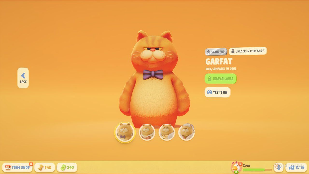 GarfatはGarfield the Catに深くインスピレーションを受けていると仮定するのは簡単です。このゲームは彼をより大きな猫に変え、それが彼の怠zyで食いしん坊の性格をより紹介します。他の毛皮のような動物と比較して、彼は比較的かわいいキャラクターを作り、ラザニアを探している間に敵をノックアウトすることを選択できます。