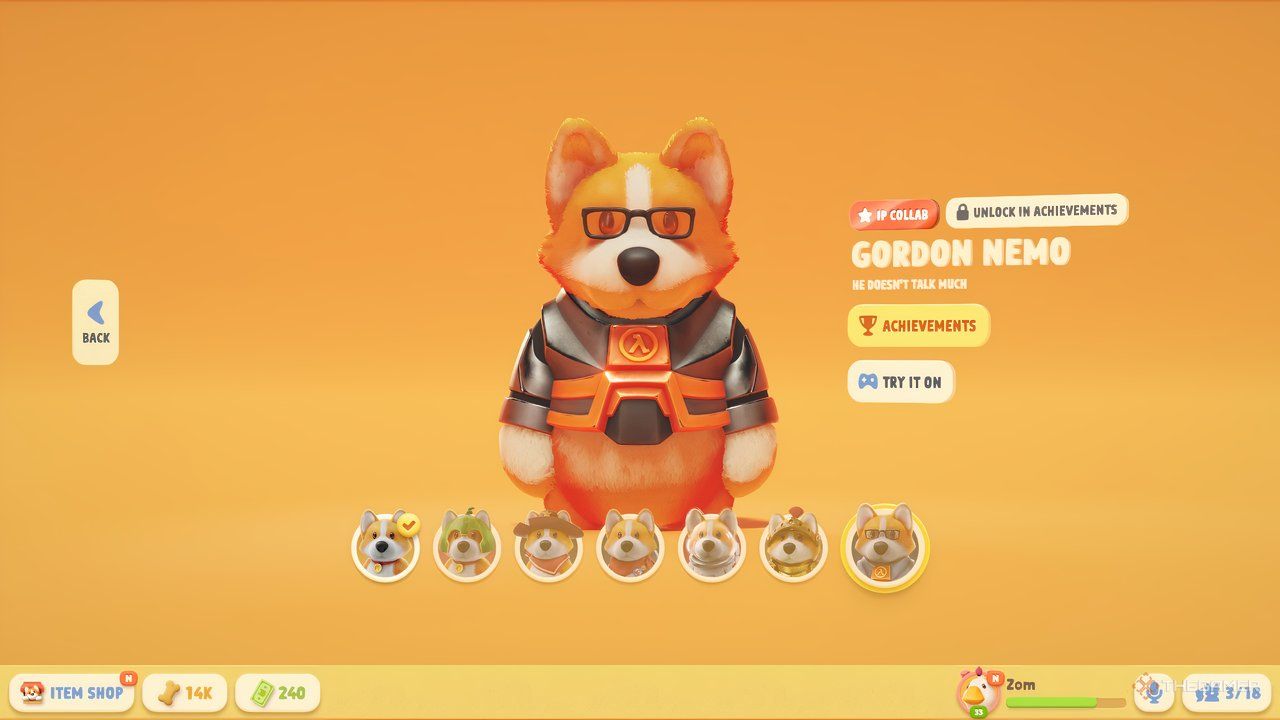 パーティー動物のマスコットであるネモは、特定の猫と一緒にゲームのマーケティング資料の多くに示されています。ゲームを開始するときに開発者のロゴと一緒に見られるキャラクターであるこのかわいい犬には、最も想像力豊かで創造的なスキンがあります。