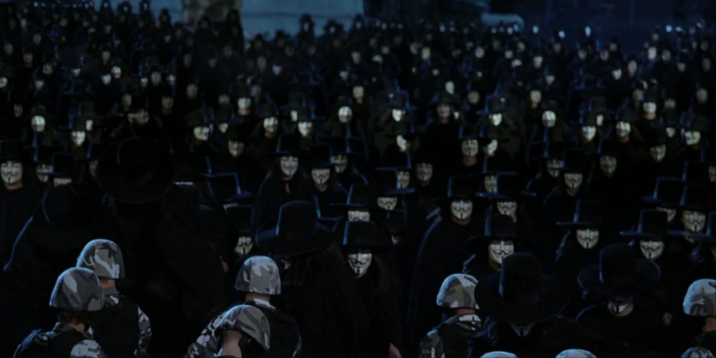 Guy Fawkes MaskとZorroを連想させる衣装を着て、Vは、彼の大義により多くの自由の戦士を刺激することを望んで、全体主義社会を絶えず混乱させます。彼はまた、ナタリー・ポートマンのエイベイ・ハモンドを救助します。エンディングと全体的なストーリーは重要かつ幻想的であり、映画には思い出に残る引用がたくさんあります。