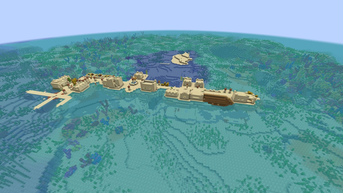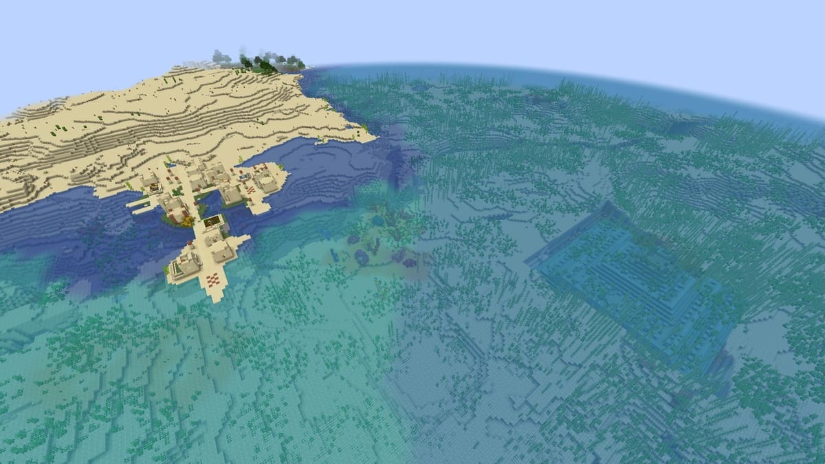 この種は、スポーンの小さな村を緑の海の島のように見えるようにしますが、実際には巨大なマングローブの沼地の真ん中で失われた砂漠のバイオームの小さなパッチです。この巨大なバイオームの端に到達する前に、500ブロック全体が必要になります。だから、頑丈なボートを作って旅行してください!