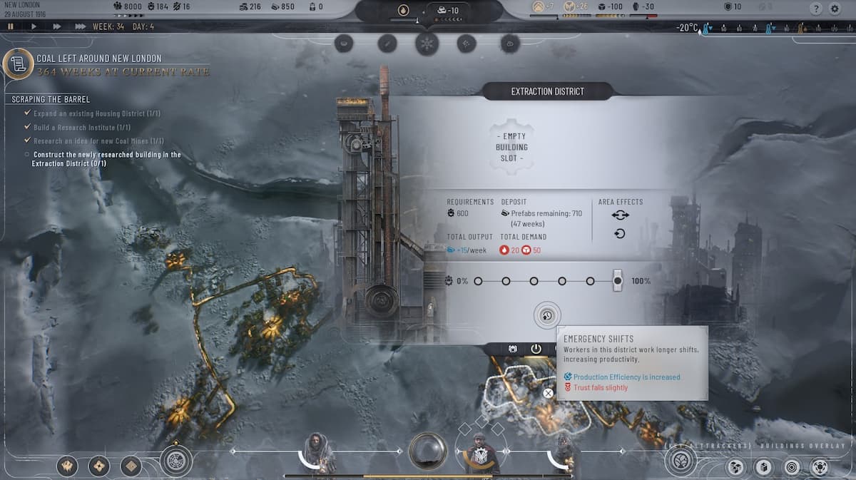 Frostpunk 2には効率を最適化する方法がありますが、それは都市のレイアウトを計画することです。たとえば、住宅地区を互いに隣に置くか、石炭を採掘する抽出地区の近くに建設することで、人々を暖かく保つために必要な暖房量を減らすことができます。