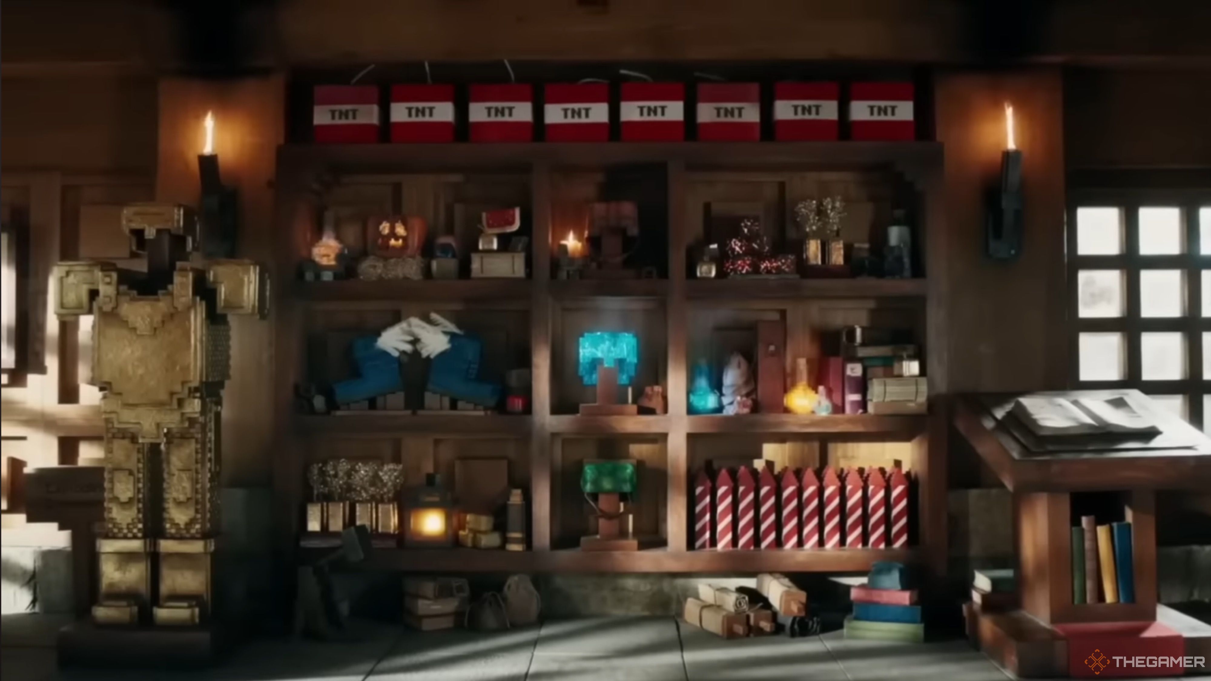 スティーブズスタッシュには、TNT、花火ロケット、速さのブーツ、ダイヤモンドアーマー、刃のような武器がたくさんあり、これらは典型的なMinecraft武器の実際のレクリエーションです。映画には、輝く金属や金色のニンジンなど、良い癒しのアイテムのような象徴的なアイテムがいくつかあります。