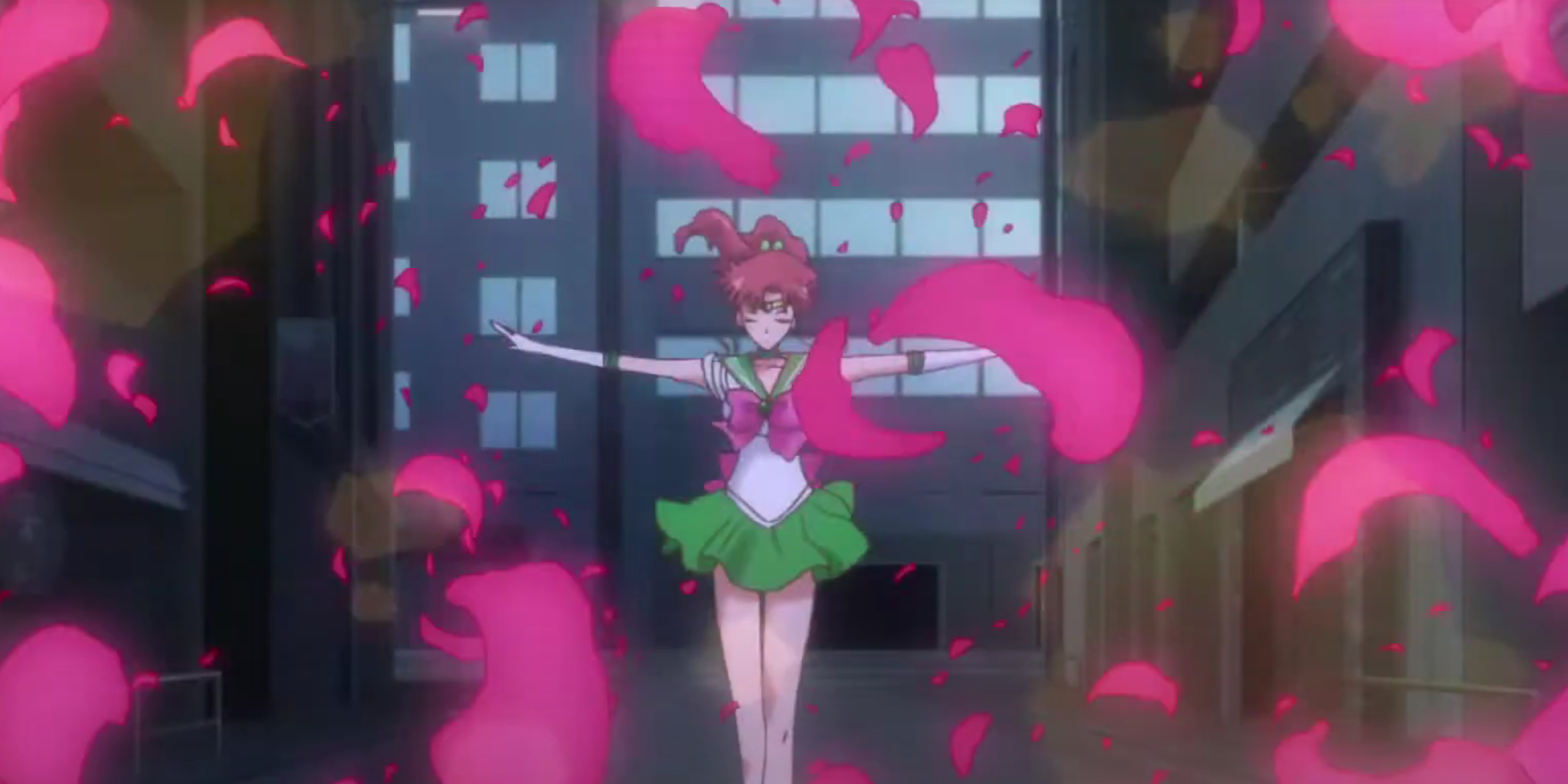 フラワーハリケーンの動きを使用して、セーラージュピターはピンクのバラの花びらを彼女の周りに召喚し、トレントで相手を攻撃します。これらは、敵をひどく損傷するのに十分な鋭いです。それは彼女がシリーズで学んだ最初の攻撃であり、彼女の女性の性質をもっと示しています。