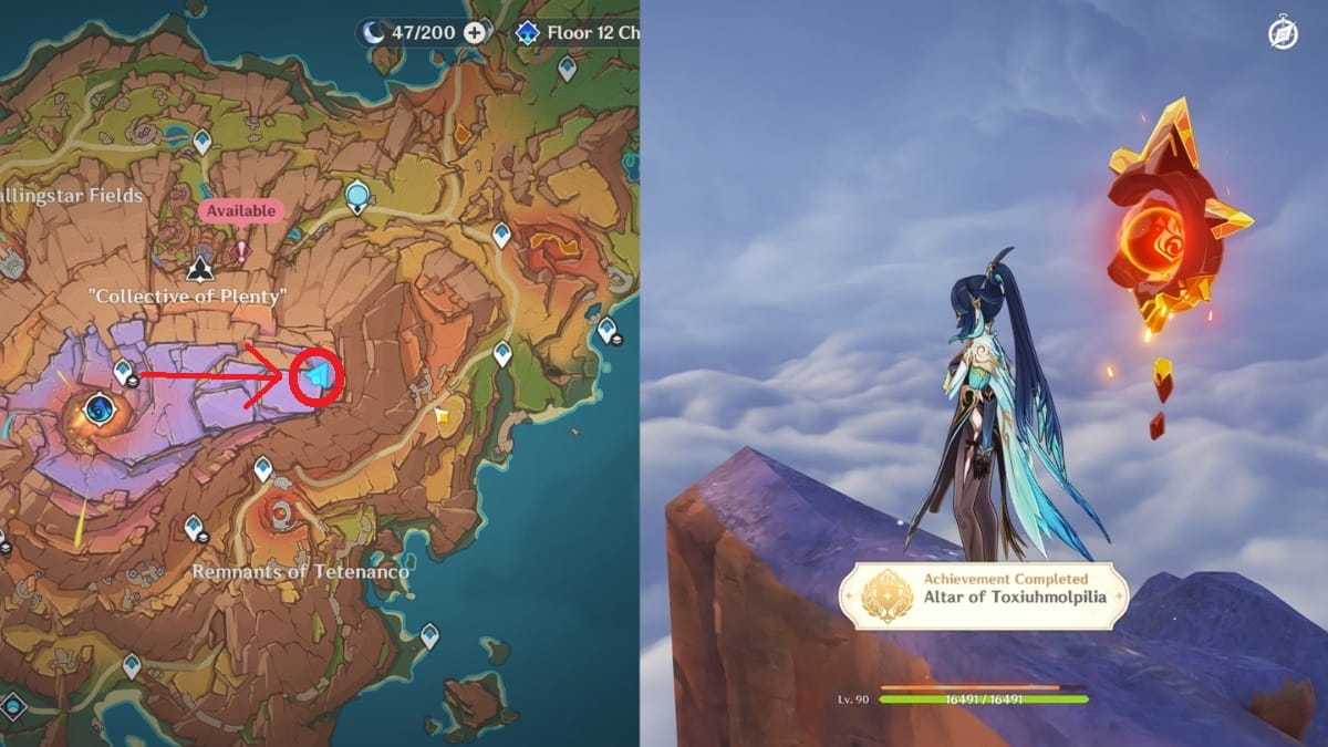 スカイファイアサークレットの北のウェイポイントにテレポートし、山のピークに向かって東に滑ります。これはあなたに与えますトキシウモルピリアの祭壇Genshin Impactの達成。