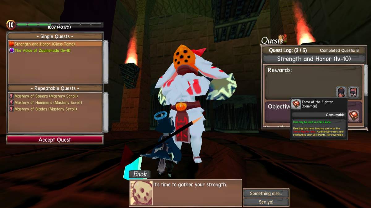 - ファイター:Emokにアクセスして、彼のクエストラインを見てください。在庫にスポーンする本の強さと名誉の探求を選択してください。
