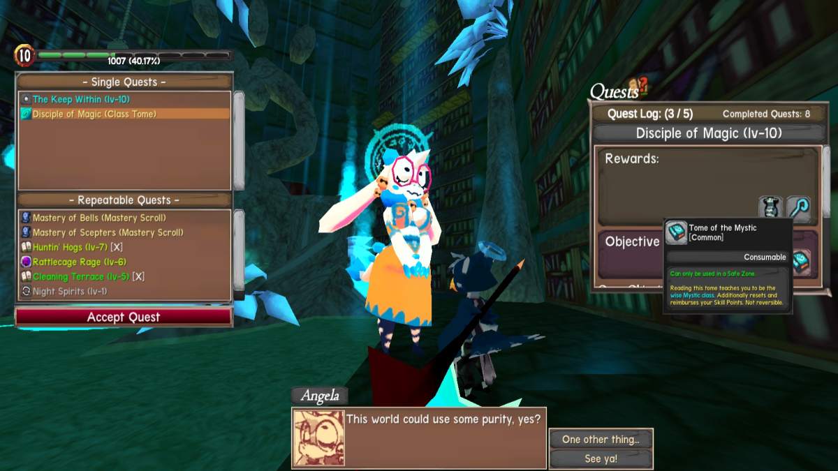 クラスはレベル10にヒットすると選択されますが、必須ではありません。ただし、ダンジョンのボスでマナとスタイルを混乱させたい場合は、クラスを選ぶことが不可欠です。アンジェラとメインクエストをヒットして、レベル10にすばやく到達することをお勧めします。クラスは、アンジェラ、サリー、またはエモックを訪問することでロック解除されます聖域内(セーフゾーン)。各NPCには、共有するユニークな本があります。