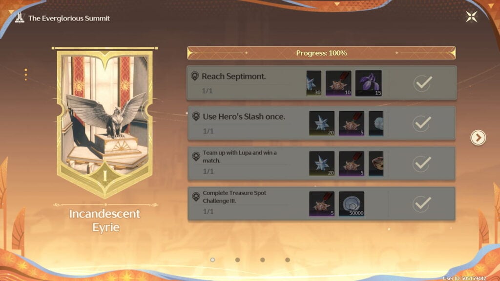 次の30日以内にログインするプレイヤーは永遠のサミット竹の虹彩を含むさまざまな材料を提供するイベント。イベントを完了するには、バージョン2.4アップデートのメインストーリーラインの一部を完了します。各マイルストーンの後、さまざまな素材で報酬を与えるメダルのロックを自動的に解除できます。