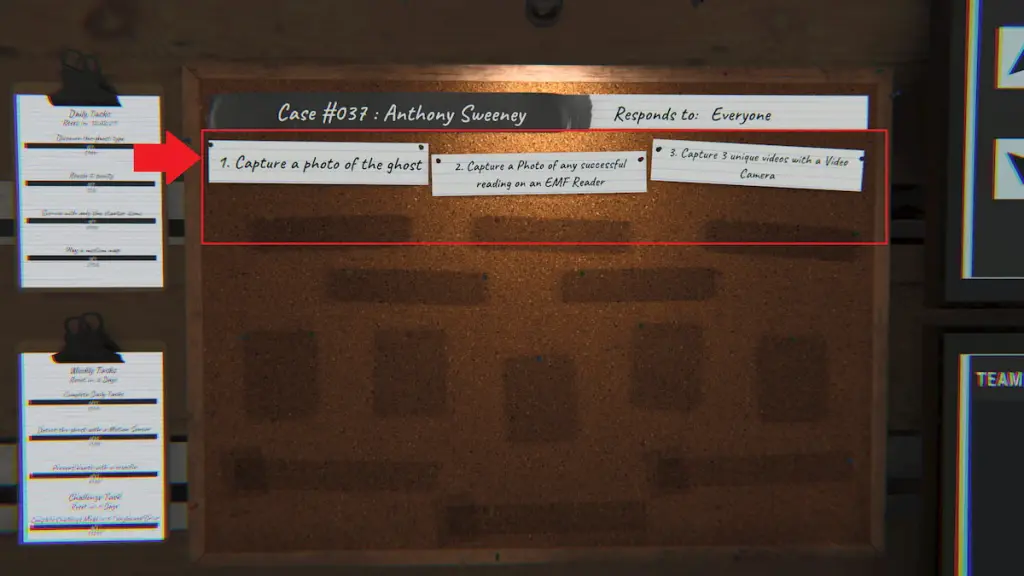 遭遇するタスクの種類はさまざまで、非常に簡単に完了できるものもあれば、非常に難しいものもあります。簡単な目標はお香を使って幽霊の近くのエリアを浄化したり、幽霊にファイアライトを吹き消させたりするようなものですが、難しい目標では、幽霊のビデオを撮影したり、2 つのユニークな超常現象の音を録音したりすることが求められる場合があります。