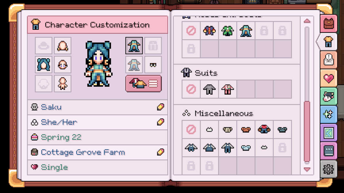 Mistriaのフィールドでの外観を変更するには、メニューを開いて、[文字]タブを選択します。右側では、衣装の個々の部分をクリックして、着たいものを選択できます。