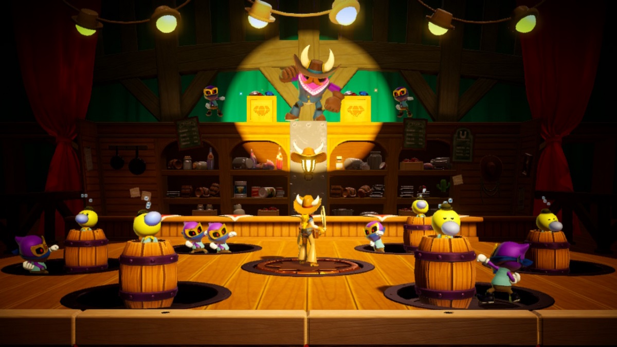 今、あなたは居酒屋の敵に直面しています。敵がいますが、内部にある樽もいます。ラッソを使用して樽をつかみ、敵に投げて、それらを倒し、同時にそれらを解放します。ボスの敵が逃げる前にすべての人々を解放した場合、あなたは輝く宝石を受け取ります。