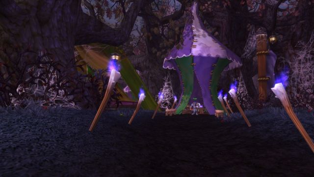 セージのテントは、ダークムーンフェアのメインパスの終わり近くにあり、トーチに照らされています。 Dot eSportsによるスクリーンショット