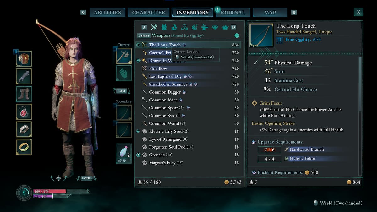 | 長いタッチ | 弓 パワー攻撃の10%のクリティカルヒットチャンス 完全な健康状態の敵に5%のダメージを与えます | Paradis Militia Merchantから購入できます。 | ![]() |
