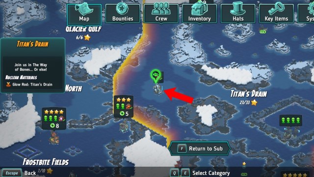にアクセスしてください蛇口でタイタンの排水と話してくださいフード付きフィギュア左下。彼らはあなたの潜水艦に乗って、あなたにグローロッドを与え、彼らの秘密のアイデンティティを明らかにします。ついに!