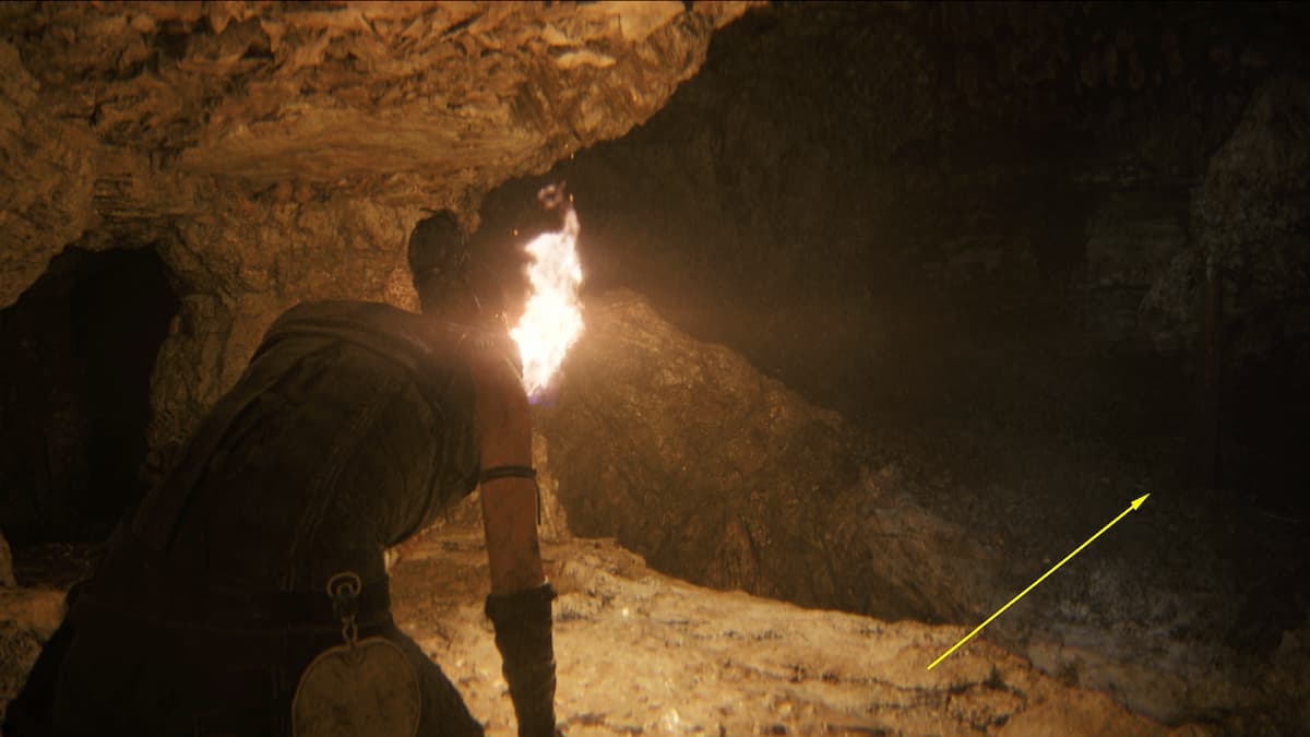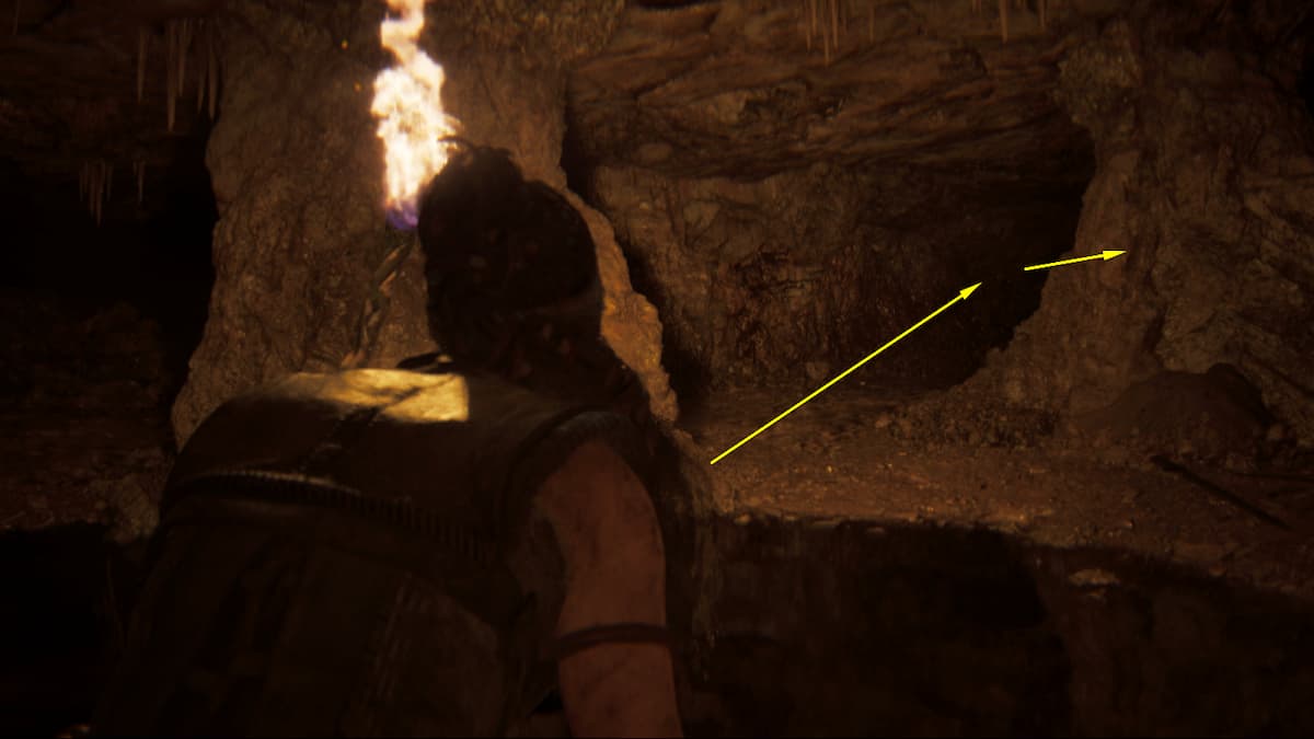 最初の巨人と戦った後、女性のリーダーをビーチに向かって追い始めたら、大きなオープンフィールドに到達するまで彼女を追い続けてください。そこに着くには、多くの棚を落として壁に登る必要があります。次に、フィールドで右折すると、伝承のトーテムが遠くに突き出ているのがわかります。それに向かって、左右に向かって岩の棚をたどります。トーテムに到達するためにクロールできる開口部が表示されます。