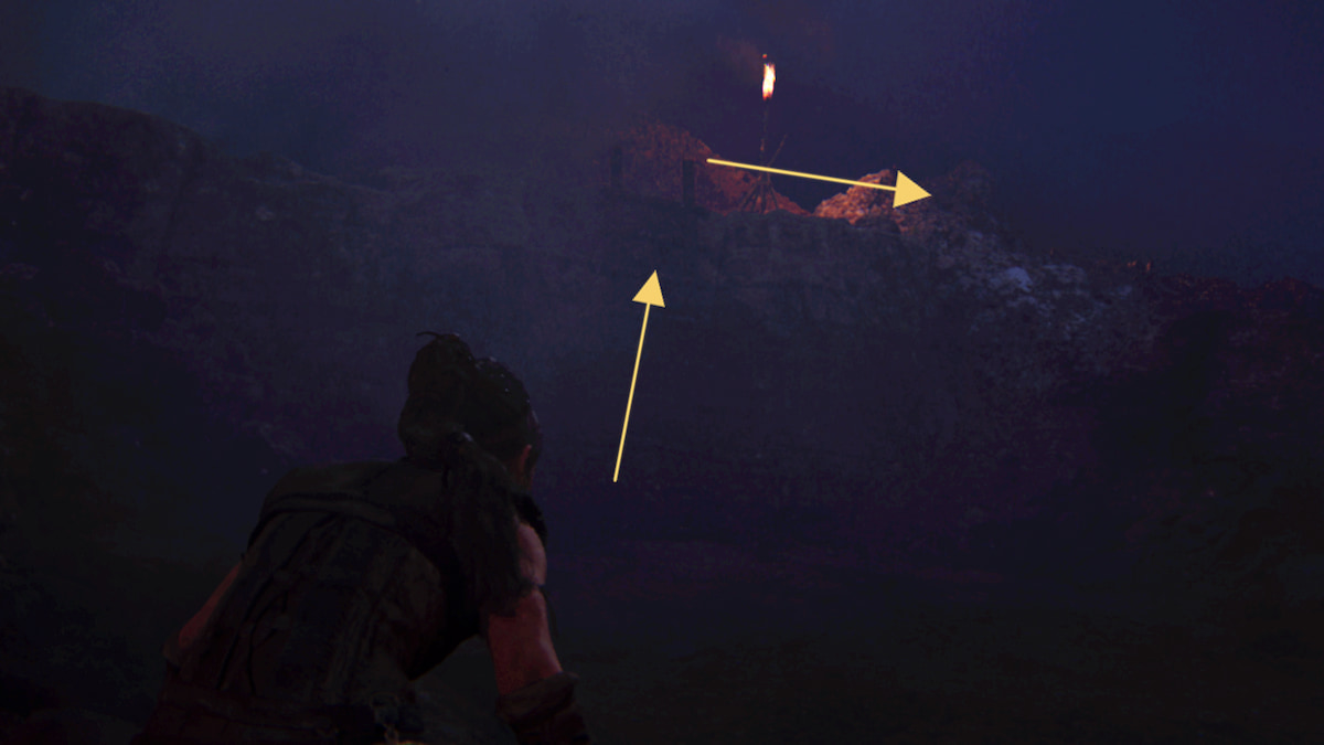 Draugarセレモニーキャンプに出会った後、次のトーテムを見つけることができます。セヌアがしゃがみ始めたら、棚から落ちるまで道をたどり続けてください。落下したら、左に出ると、木製のはしごが登るのが見えます。はしごを登って道をたどり、岩の壁を右に飛び越えます。 Lorestangirは、行き止まりのパスの最後にあります。