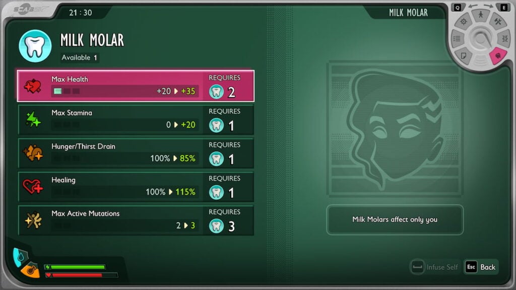 通常の臼歯を使用すると、アップグレードできます最大の健康、スタミナ、および活発な突然変異。また、アイテムを使用して、飢え/渇きの排水溝を減らして、食物や水について頻繁に考えずに大きな冒険をすることで癒しを増やします。 Mega Molarsを使用して、チームの最大消耗品、リソース、矢のスタックサイズを増やすことができます。