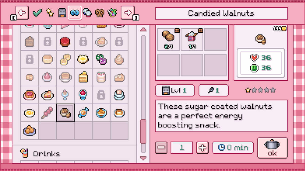 数日ごとに、1つのクルミが深い森のカルダルスの寺院の南の木々に産卵します。初めてそれらを採餌した後、海運ビンを使用してそれらを販売すると、翌日に砂糖漬けのクルミのレシピが届きます。消費されると36のスタミナとエネルギーを回復し、キッチンの層でいつでも調理できます。