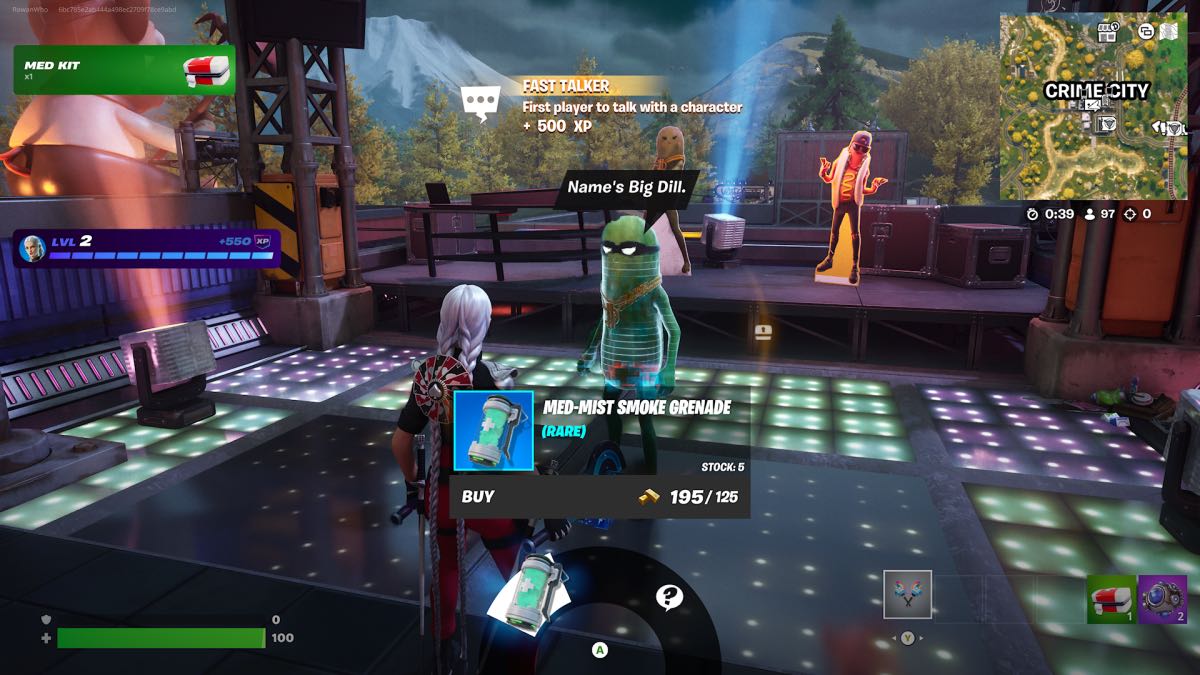 ビッグディルは、この地域の中央にある建物の上にある犯罪都市にあります。彼は125の金のバーにメッドミストスノークグレネードを提供し、Fortniteのよりカラフルなキャラクターのいくつかにインテルを持っています。