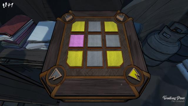 ここでドラフトできるすべてのユニークな部屋の中で、トレーディングポストそれらの1つであり、部屋の中に小さなパズルを見つけることができます。パターンを理解し、各コーナーのすべての黄色の正方形を作成し、それを開いて手当トークンを取得することで、このパズルを解くことができます。これは、ゴールドコインを補充し、お店に費やして希望するツールを手に入れるのに最適なバフです。