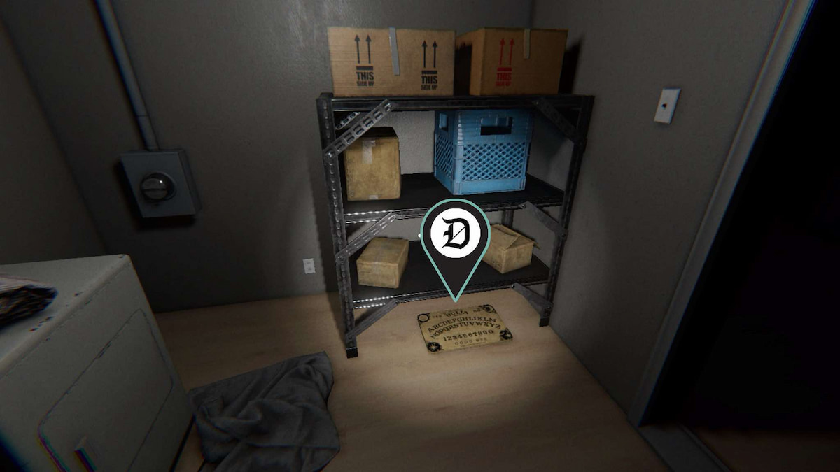 Ouijaボードは隠れています洗濯/保管室の金属棚の下キッチンに取り付けられています。家の中に向かい、廊下をまっすぐ進みます。あなたがそれの終わりに到達したら、キッチンに左に曲がります。
