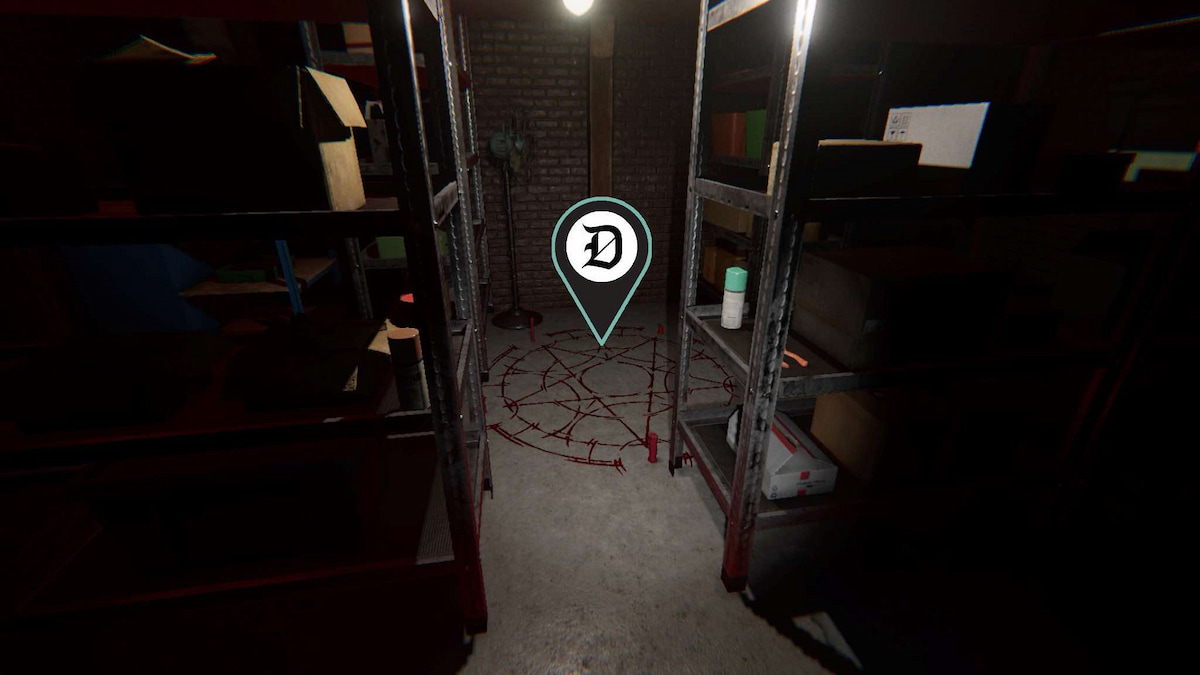階段を下りて、小さな地下室の廊下に入ります。少し前進してから、右側のドアを開けます。背の高い棚の多くの列の後ろには、部屋の右隅の近くに隠れている地面に召喚サークルがあります。それは右に赤く、地面に描かれ、ろうそくに囲まれています。