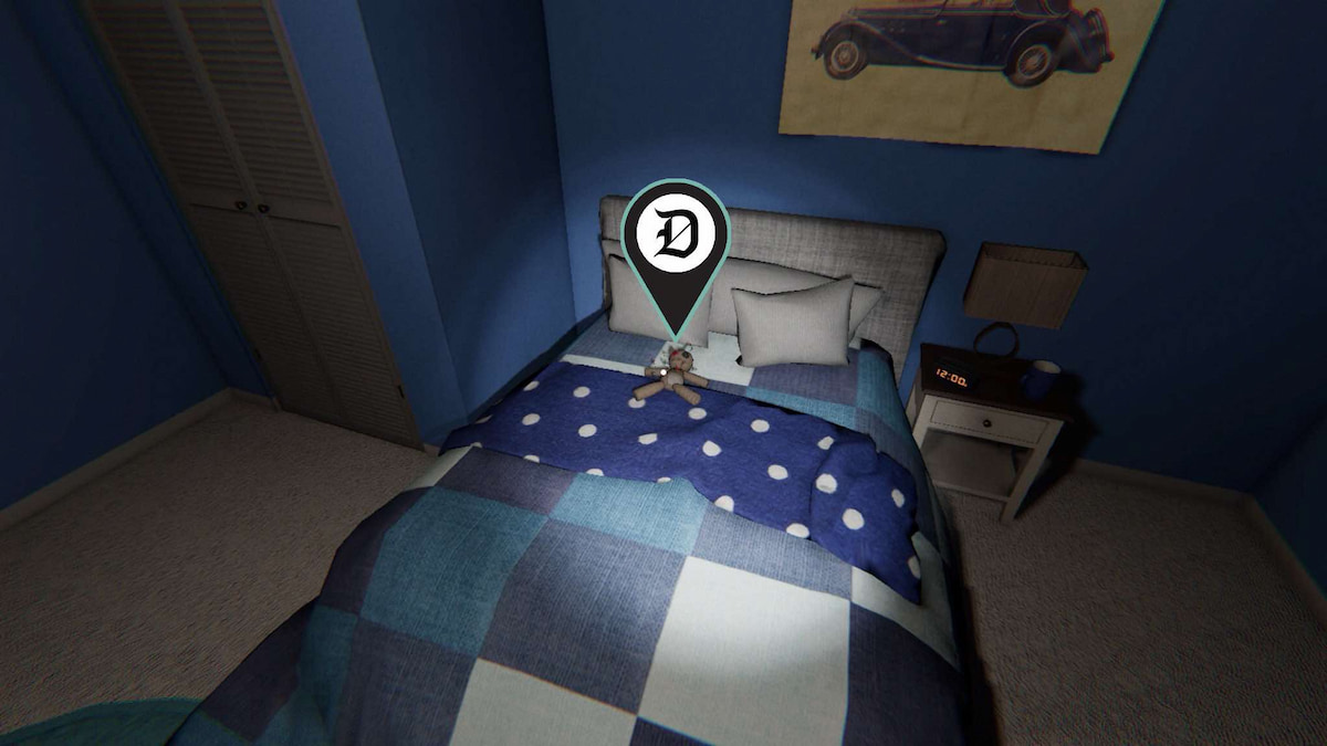 階段の頂上に着いたら、左に曲がって再び左に曲がり、最初の廊下を下ってください。最後に、次の廊下を左に続けるのではなく、右の戸口を通って進みます。内部には、部屋の真ん中にあるベッドの水玉の青い毛布に昼寝をしているカラフルなピンで覆われたブードゥー教徒の人形が見つかります。