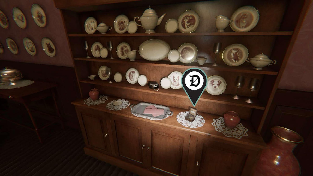あなたが見つけることができます音楽箱に座っています下棚のキャビネットでピンクティールーム。この部屋は特に雑然としており、音楽箱は非常に小さいので、それを見つけるのは難しい場合があります。正面玄関から始めて、ティールームに入るためにすぐに左を作ります。
