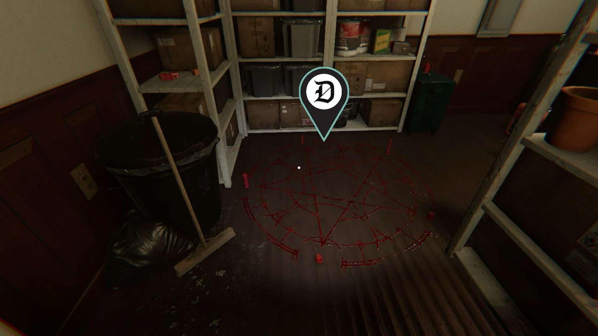 ティールームのもう一方の端にあるドアに入ると、保管場所にいることに気付くでしょう。いくつかの棚によって黒いゴミ箱の近くを見下ろして、使用されるのを待っている明るい赤い召喚サークルを見つけます。