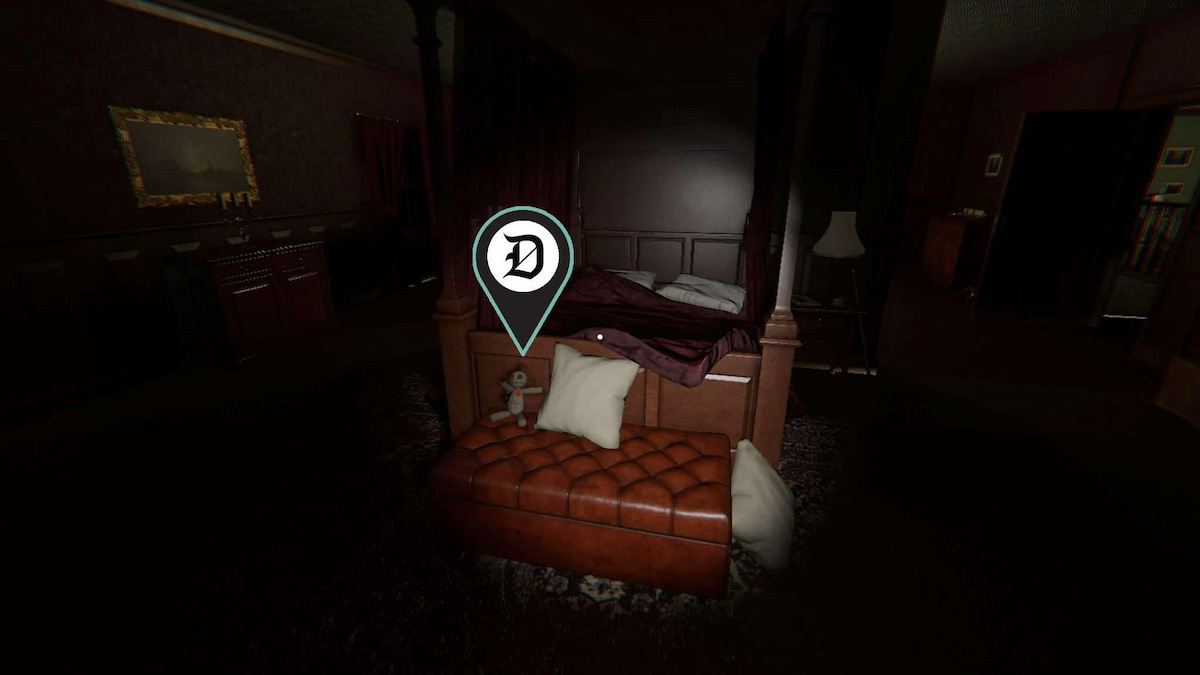 右側に戸口が見つかるまでホールを下り続けます。内部に向かい、マスターベッドルームを見つけます。左に行き、ベッドの端にあるオットマンを見つけて、ブードゥー教の人形が座っているのを見つけます。