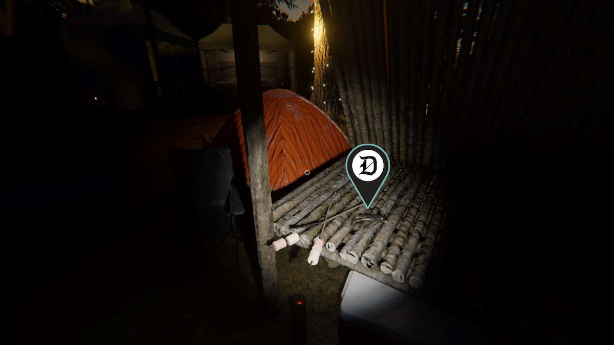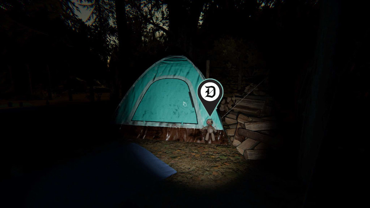 ブードゥーの人形はです後ろのフェンスの近くの小さなターコイズブルーのテントに寄りかかるキャンプウッドウィンドで。キャンプの中央にある巨大な木を通り過ぎ、キャンプファイヤーのそばに行き、バスルームを通り過ぎてこのエリアを見つけるために進みます。