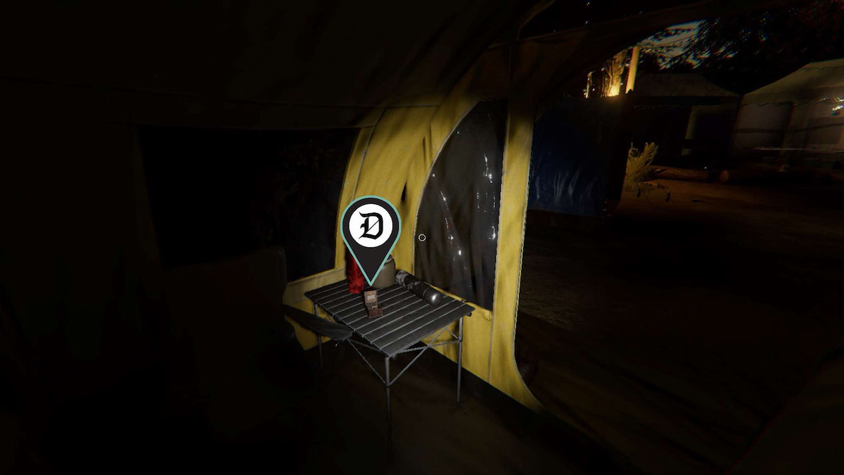テントフラップを開き、内側に向かいます。右を見下ろして、そこの小さなテーブルに座っている音楽箱を見つけてください。このテーブルにはいくつかの乱雑なアイテムが散らばっていますが、音楽箱は正面に座っているため、見つけるのがかなり簡単になります。それは小さな茶色の素朴な箱です。