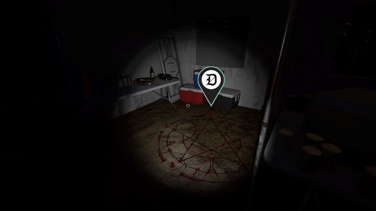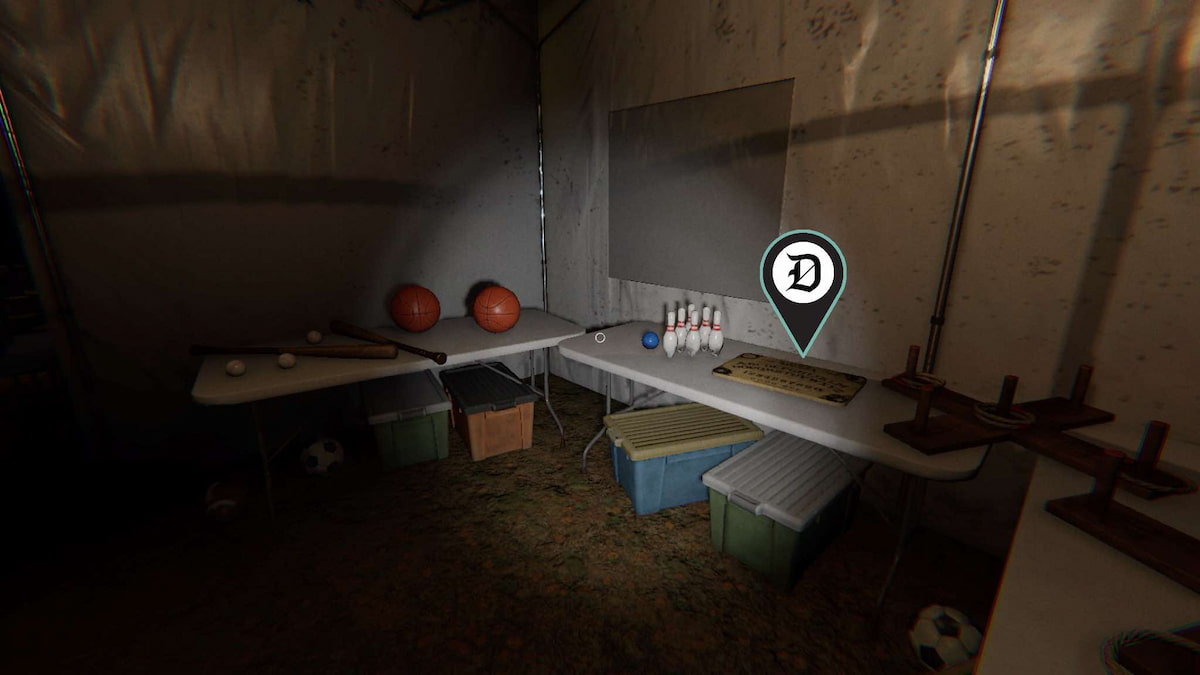 この呪われたオブジェクトは、他の多くのゲームや、テーブルに散らばっているいくつかのスポーツ用品の周りに座っています。テントの真ん中にあるボウリングピンとボウリングボールの右側に直接見つけることができます。