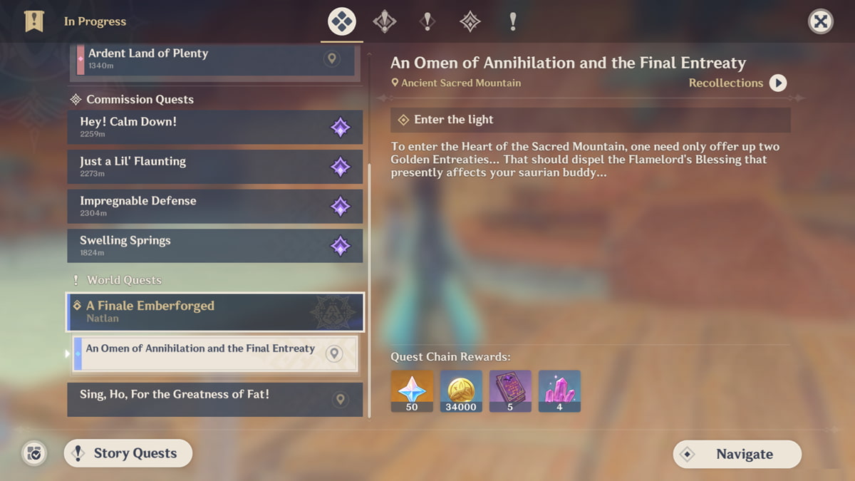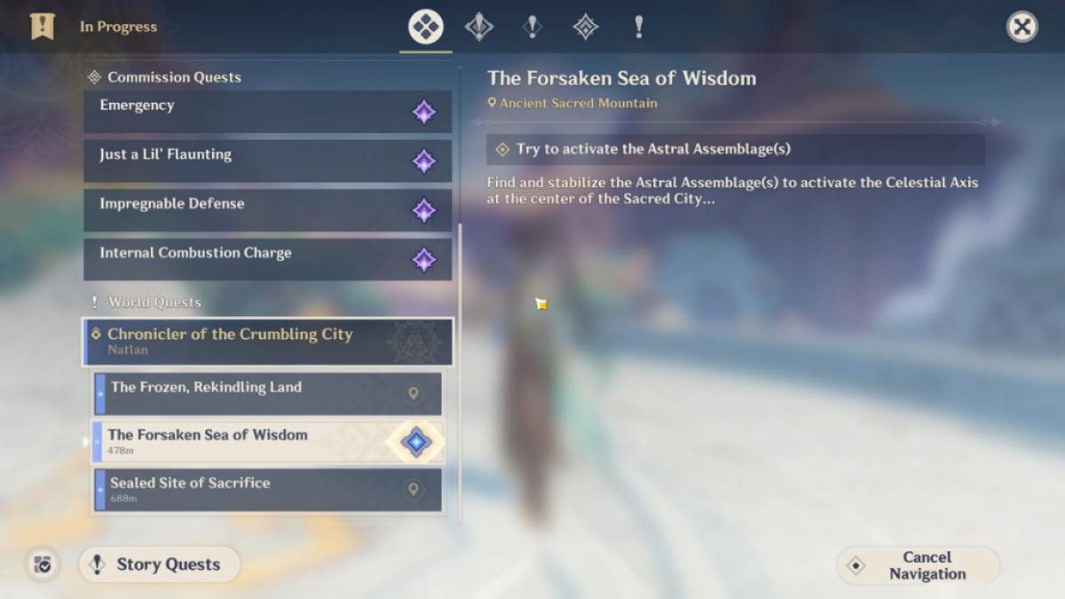 ナワッツィンの跳躍を完了すると、ゲンシンの衝撃で凍った、再燃した土地の探求が自動的にトリガーされます。後者は、崩壊しつつあるシティクエストチェーンの記録者の最初の部分でもあります。クエスト中に、さらに2つのサブクエストのロックを解除します。