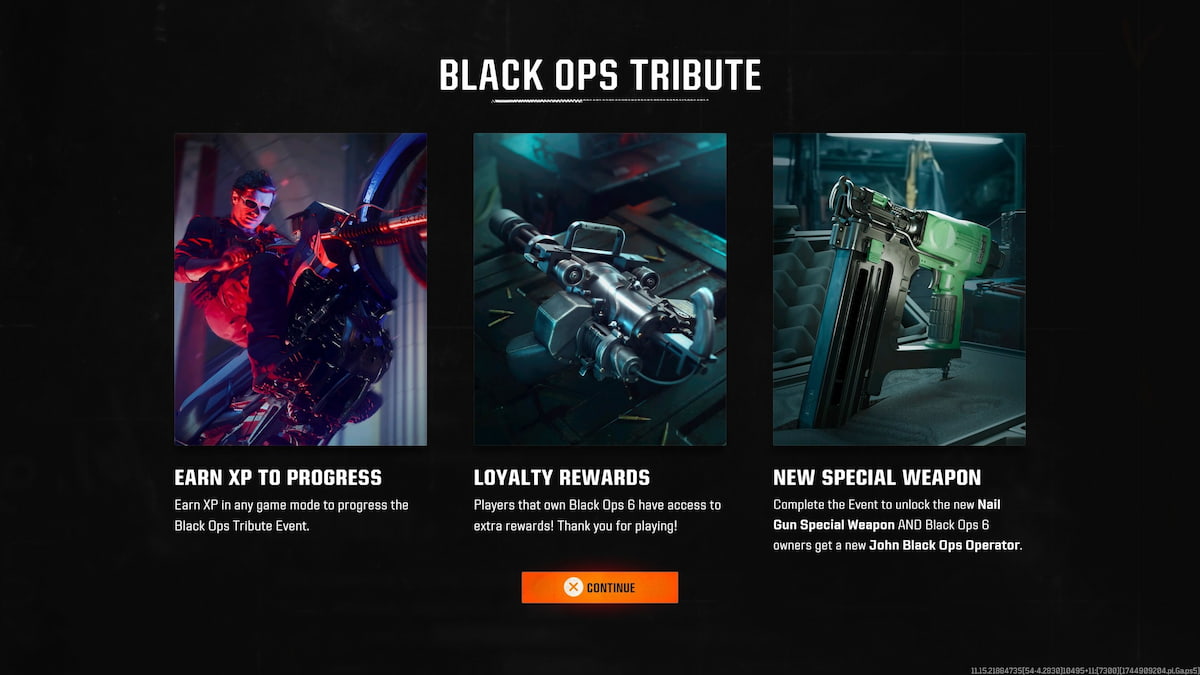 上記の報酬がすべてロック解除されると、イベントの2つのマスタリー報酬にアクセスできます。ネイルガン特別な二次武器とジョン・ブラック・オプスオペレータースキン。他のすべての報酬とすべてのXPしきい値が渡されたことを確認してください。蓄積している二重XPトークンを使い果たすだけで、それらをすべて迅速に完了する必要があります。