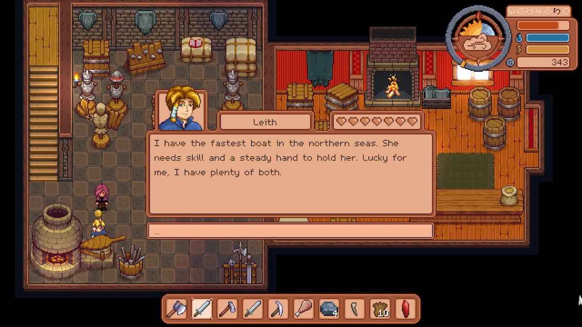 北上では、クラフターリースが住んでいる雪に覆われたフリースタッドを発見します。彼は主にギアと武器の世話をしていますが、町で最も速いボートの1つを持っていると主張して、セーリングにも興味があります。