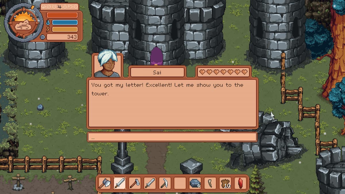 Thabisaに加えて、Moon Hollow Towerの近くでSaiに出会うでしょう。彼は最初はあなたを他の誰かと間違え、あなたがタワーの修理を任されたペクニアの代表者であると信じています。この努力で彼を助けるために、あなたのオカルトの力をさらに進める必要があります。