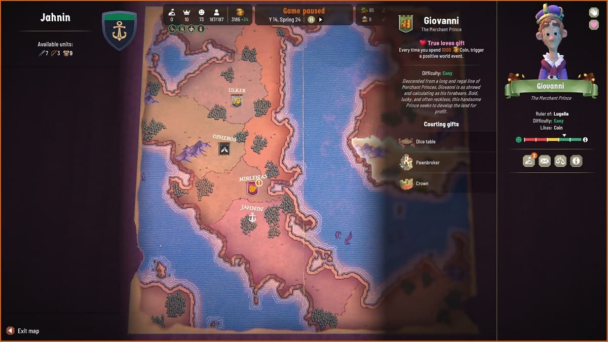 おそらく予想通り、商人の王子として、ジョバンニは恋をしていますコイン。しかし、これは彼の関係を高め、他の支配者と比較して彼をかなり簡単に求愛します。あなたは本質的に彼の愛をお金で買います。それから、彼の本当の愛の贈り物はそれを作り、1,000コインを使うことでポジティブな世界イベントを引き起こすようにします。