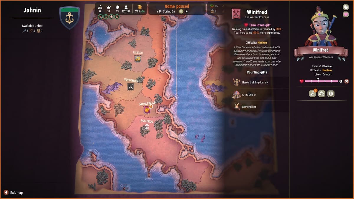 ウィニフレッドはロマンスにとって最も困難な王女です。彼女は戦闘が好きで、ペインirのように、彼女の好みの贈り物は石炭です。大きな軍隊の建設を計画している場合、彼女の本当の愛の贈り物はかなり便利です。あなたの兵士を訓練するのにかかる時間は半分に減り、あなたのヒーローは二重の経験を獲得します。私は私のロマンスのためにウィニフレッドを選びました、そして、彼女の2番目のミッションには、準備に時間がかかるまともな数の兵士が必要です。