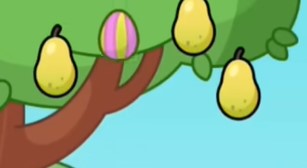 - 木製の厚板橋の上の木を見上げます。洋ナシの隣にはイースターエッグが見えます。