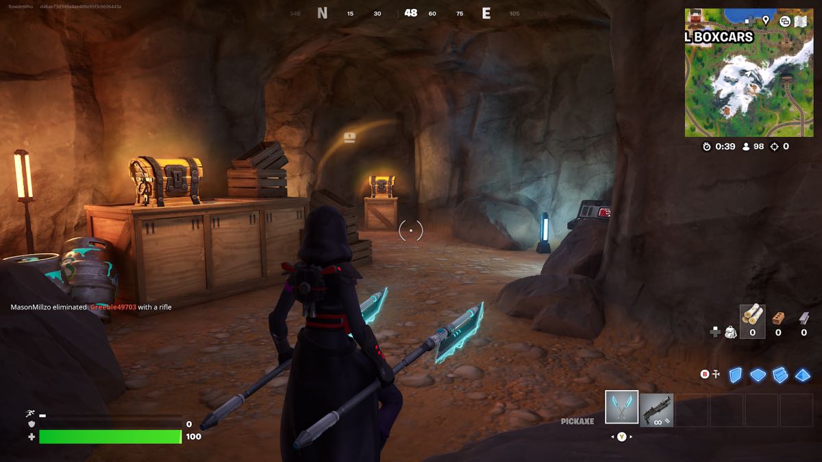固定されると、銃は岩でレーザーを撃ち、それらをバラバラに壊し、秘密の金庫の入り口を露出させます。金庫の中には、少なくとも4つの胸、いくつかの丸い樽、いくつかの岩と物体が材料を収穫するオブジェクトがあります。
