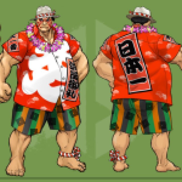 Street Fighter 6のE. Hondaの衣装3は彼の休暇服です。彼のシャツには、相撲に関連する日本の表現があります。彼の背中と右肩には、「ニッポン・イチ」または「日本最高」と書いています。彼のシャツの前には、「すべての座席が販売されている、ありがとう」に翻訳される標識があります。これは、座席が残っていないときに、相撲ホールのバナーに書かれています。彼の左肩には「Shoubu Ari」があります。これは、「私たちには勝者がいる」と同様に、試合が終わったときに叫ばれます。彼の帽子と足首の周りの赤と白(コウハク)のコード(ミズヒキ)は幸運の象徴です。