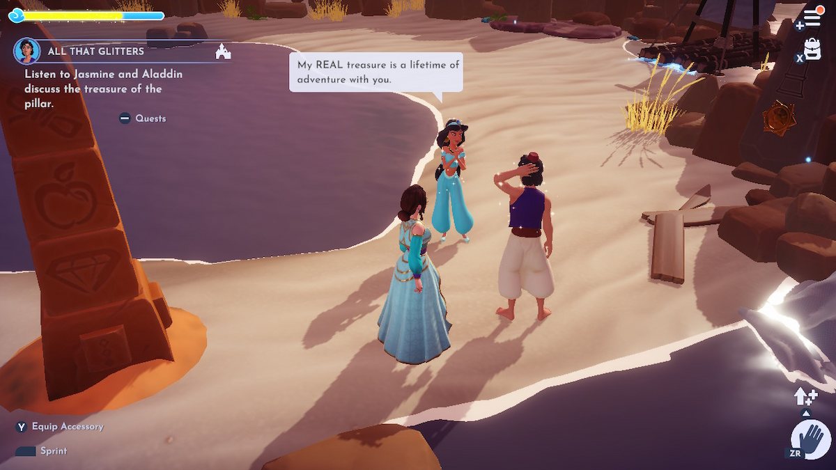 すべての輝きは、アラジンから与えられた友情の探求です。ロックを解除するには、アラジンとのレベル7の友情に到達し、ベルとの進歩、アリエルのロックを解除する必要があります。私が遭遇しなかったこのクエストには秘密の前提条件があるので、ジャスミンのレベル10の友情クエストとその後のミニクエストを完了する必要があるかもしれません、記念品、 これには簡単な会話が含まれますマーリン。これらは、私がそのすべての輝きの前にした唯一の追加のクエストです。
