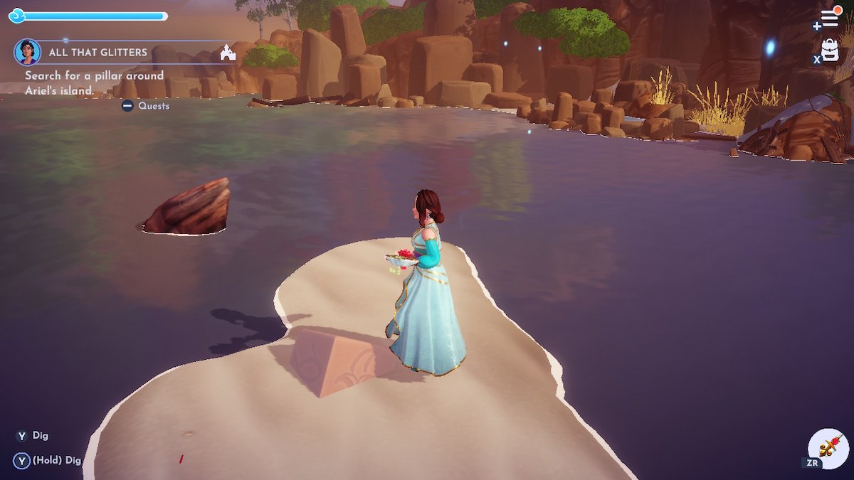 手がかりを手にして、あなたとアラジンは宝物がアリエルの島に隠されていると判断します(ラフトスカルロックの隣の島から)。到着すると、調査を開始すると、島の左側にピースが欠けている奇妙な岩が発見されます。島の右上を検索すると、ゴールデンキーがあります(太陽)あなたが岩に置くことができること。手がかりは、存在することを示しています丸薬あなたが見つける必要があること。