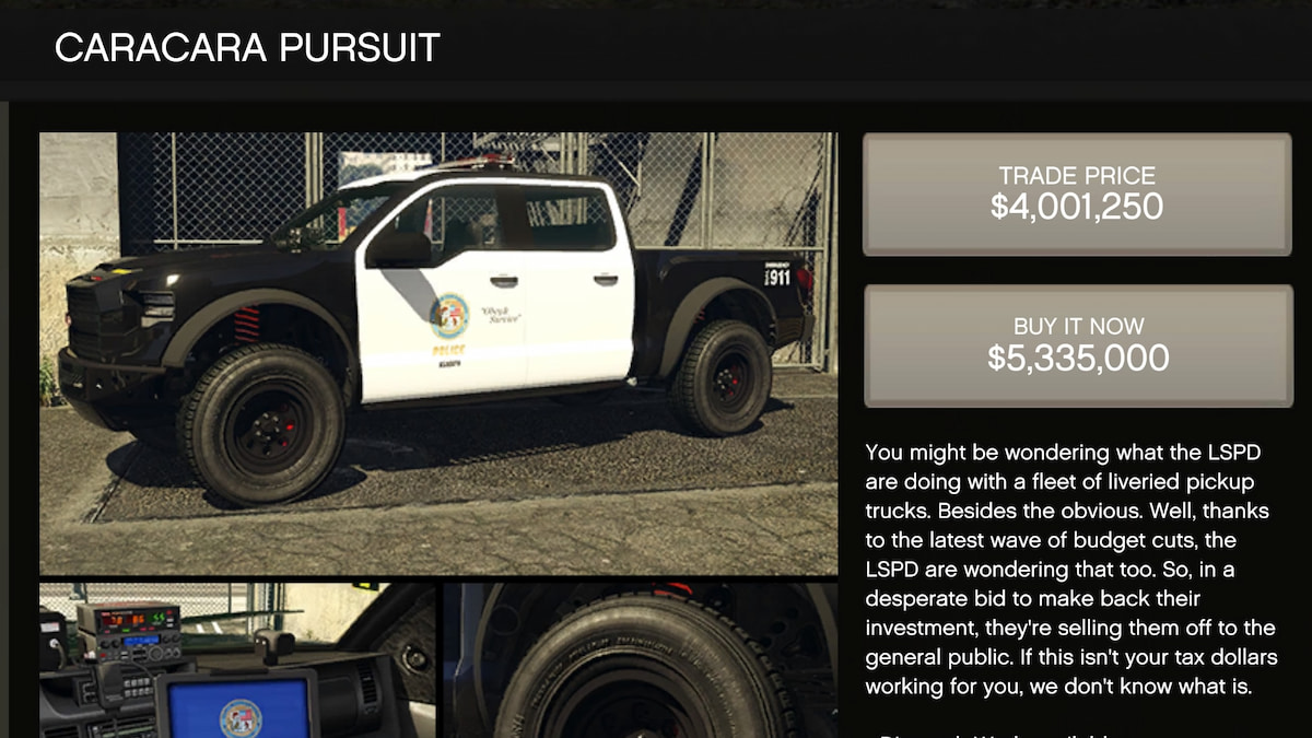 カラカラの追跡は、新しい警察版のピックアップトラックで、見た目よりも厳しいように見えます。それを購入するには、プレイヤーが完了する必要がありますCluckin 'Bell Farm RaidのSlush Fund Missionリーダーとして、しかし貿易価格はより手頃な価格です。