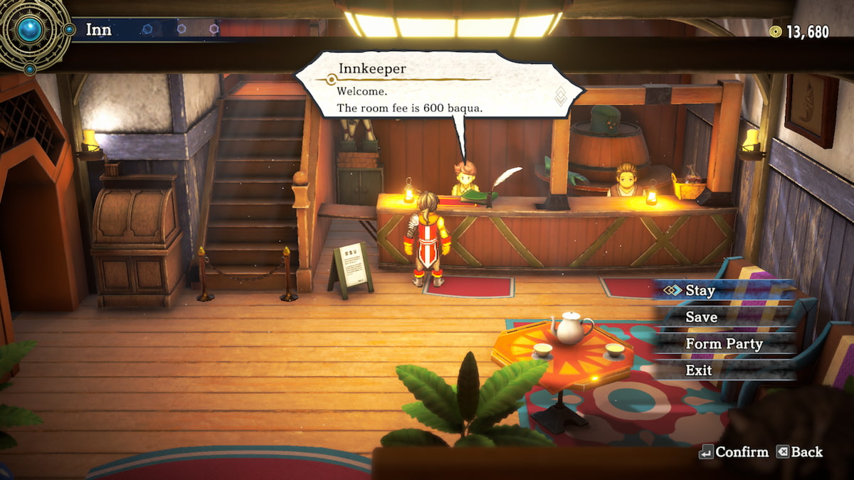 そこでは、カウンターの後ろの宿屋のキーパーと話をして、「滞在」オプションを選択できます。宿屋あたりの料金は、町とあなたがいる場所によって異なる場合があります。ただし、常に500以上になることになります。 「滞在」することを選択すると、簡単な読み込み画面が表示され、すべてのキャラクターが健康とMPを復元します。